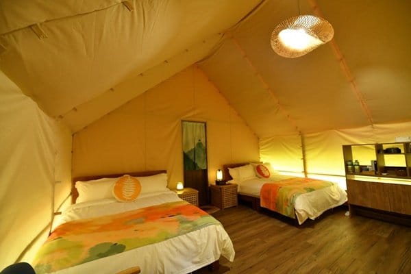 業者斥資數千萬,領先業界,第一期建置26頂豪華露營帳篷,設有二人與四人房型,每帳皆挑高5米、擁有12坪專屬空間,帳內寬廣舒適毫無壓迫感,另配置冷暖空調、五星酒店等級床鋪設備,匠心獨具打造全台首創帳篷內寬綽大氣豪華浴室,配置獨立浴缸並選用知名品牌免治馬桶,整體規格奢華升級,在帳篷內就能享受愉悅山林浴沐泡澡時光,讓旅人們於舒適自在的空間中徹底放鬆身心靈。另外,園區內亦規劃有草坪遊憩區、DIY體驗、攀樹活動、生態導覽、藝文表演、客製化戶外婚禮…等豐富有趣的體驗活動。餐點方面一泊三食全包式服務,晚餐除了BBQ燒烤串食、獨家配方養生鴛鴦鍋外,早晚餐皆有澎派的自助吧及現煮煎台無限供應美食,各種山珍海味任你吃個過癮,令人為之驚豔的露營用餐境界!只要帶上簡便行李即可輕鬆入住,適合全家大小、伴侶、團體住宿旅遊,相約共同感受親近生態之旅體驗與自然共舞的美好時光。