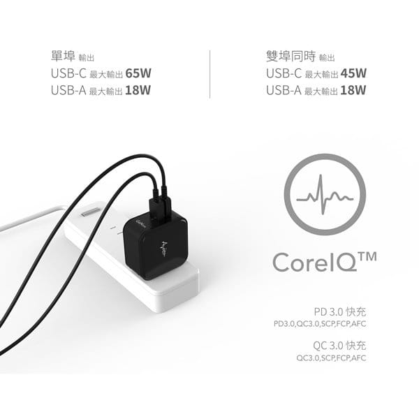 CLASSIC GaN 65W氮化鎵快充電源供應器,採用 CoreIQ™ 1.0 智慧分流輸出科技,能依裝置電力需求,智慧動態調節輸出效能。在輸出功率規格上,單埠獨立使用時,USB-C的最大充電功率可達65W、USB-A的最大充電功率達18W;雙埠同時使用時,則會自動分配輸出功率,讓USB-C提供最大45W、USB-A提供最大18W的功率。因此大至輕薄筆電、平板或手機,小至僅需微電流的隨身穿戴裝置,都能廣泛應用。