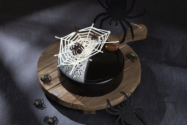 暗黑蜘蛛網-不同以往繽紛色彩的甜點,主廚為萬聖節特別端出暗黑系蛋糕,外層以巧克力糖釉呈現晶亮黑外型,襯托以白巧克力勾勒出的蜘蛛網線條,上面還有幾隻栩栩如生的蜘蛛爬行,不僅造型十分吸睛,獨特風味亦是令人驚豔!柔軟綿密的巧克力海綿蛋糕,內藏黑莓果醬餡,再以帶有伯爵茶香的奶油慕斯包覆,茶香與苦甜可可和奶油慕斯交織堆疊,多層次口感讓人情願深陷在這暗黑裡。
