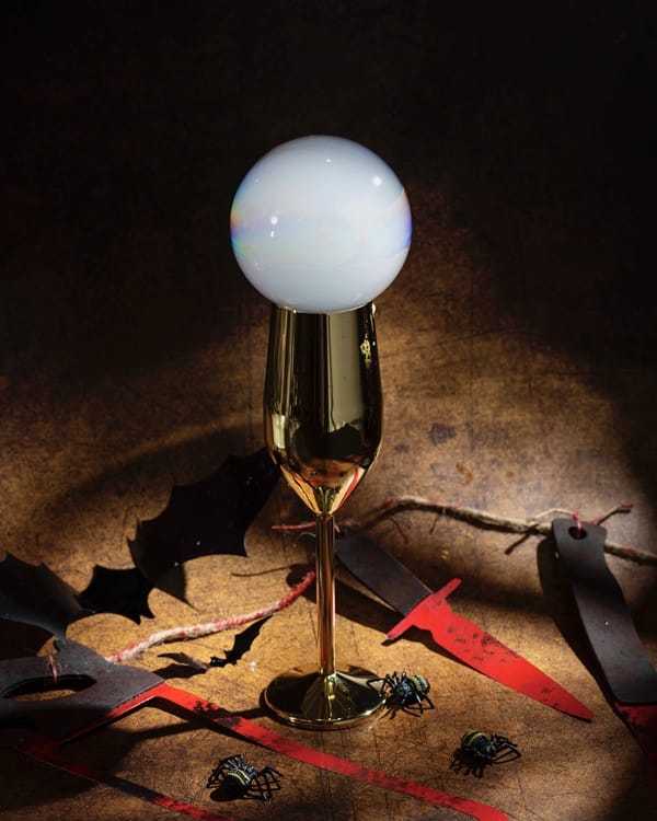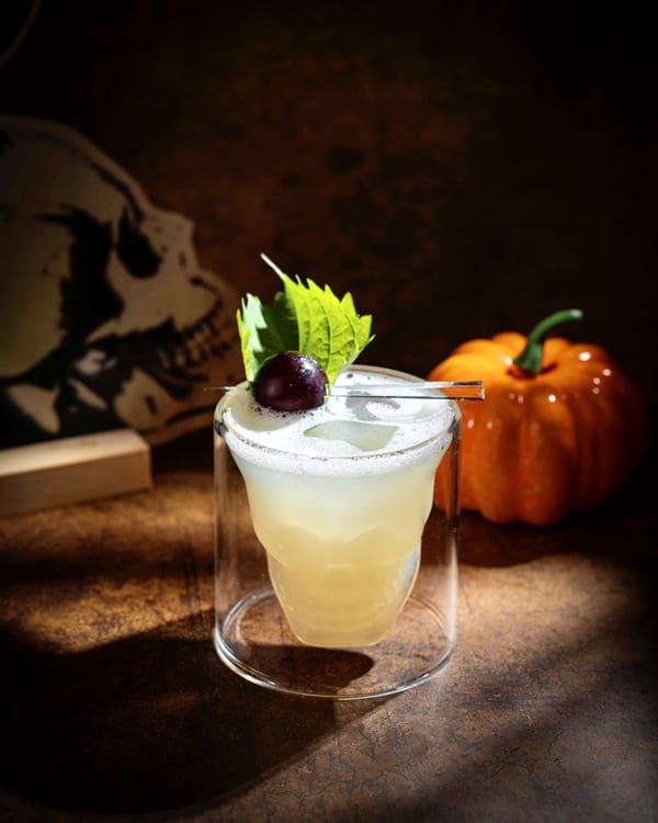 女巫的獻禮-調酒師特別在香檳杯上吹製一顆水晶球泡泡,好似可看透未來的女巫,以帶有草本清香的龍舌蘭為基酒,加上葡萄柚與檸檬汁,最後再以蘇打水調和,看似簡單的材料,一飲而下,舌尖即刻感受到碳酸氣泡與果酸相互流竄宛如閃電,好似女巫藥水神秘誘人,一抹萬聖憂懼油然而生。