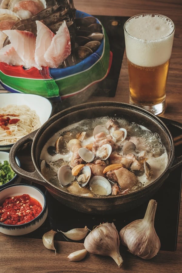 三大明星鍋品,「oh my god!剝皮辣椒雞好吃喔!」金熬剝皮辣椒雞鍋,湯底含剝皮辣椒、蛤蜊、蒜頭、帶骨雞腿肉,鮮甜雞湯與剝皮辣椒的微辛甘甜特性,賦予更多層次的滋味,一口過癮滿足,一鍋暖心滋補。超人氣的金銀蒜頭蛤蜊雞鍋,精選以金、銀蒜頭搭配蛤蜊熬煮白濁湯頭,湯汁融合蒜頭獨特香氣與蛤蜊鮮美滋味,讓雞腿肉與肉片都更增添風味,一喝停不下來。嗜吃麻辣口味火鍋,大推辣子爆雞乾溼雙饗鍋系列,先品嚐乾鍋中蔬菜、多種辛香料拌炒雞腿肉後,充滿椒麻香氣嗆辣滋味,再注入麻辣高湯後涮煮肉片與鍋料,獨家吃法,乾溼雙饗不同的風味。其它還有經典石頭火鍋、酒香薑煸麻油雞鍋等口味,另外加59元就可升級嚴選無藥殘烏骨雞,搭配台式湯頭,讓冬季不只補身更加補心。此外,醬料也很有特色,其中主廚特調自製的雞油辣醬,口味溫潤富有層次,而由黃豆發酵所製成的米豆醬則適合沾肉片;店內可無限取用的時蔬自助吧,品牌更選用通過國際食品安全認證的截切廠,不僅高CP,更是解膩又吃的安心。