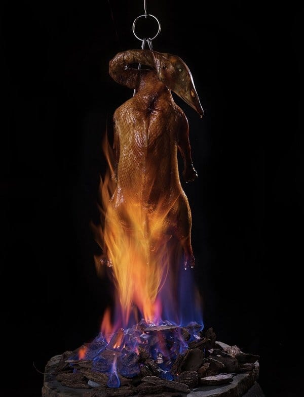 「嫣紅燒鵝」此次強勢回歸,除了第一吃的片皮鵝附全麥餅皮外,也祭出現切鵝腿,經過龍眼木的窯烤烹調後,扎實的鵝腿充滿鮮味和肉汁,讓饕客吮指回味。第二吃也提供多達六種選項,其中首推「陳皮鵝骨湯泡飯」以陳皮、美白菇和鵝骨一同熬煮多時,此道料理最大特色為在開動前,由服務人員倒入響米,倒入後猶如炮竹般、發出響亮聲響,炸過的響米略帶有嚼勁、同時吸飽湯汁,讓消費者在冬天也能獲得雙重饗受。第三吃則推薦「黑椒七彩炒鵝絲」以彩椒、洋蔥、韭黃、銀芽等食材搭配軟嫩的鵝絲及特選黑椒香氣、十分開胃。