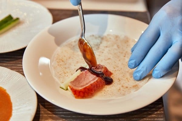 主廚除了推出三吃料理外,也再研發9種配料搭配出81種吃法。保留傳統甜麵醬、蔥段及小黃瓜外,創意的配料此次也一同加入9宮格的中,從甜菜根、蘋果絲到解膩的紅梅醬,甚至是配菜的柚香蘿蔔、自製百香果皆在此次配料中,可隨個人喜好口味隨意搭配品嚐。原價4380元+10%,僅要再多加300元,即可享用到第三吃的料理。另外,即日起平日可使用五倍振興券優惠,凡預訂「嫣紅鵝」,使用兩張千元五倍振興券,再加價818元即可體驗「嫣紅鵝.兩吃」。