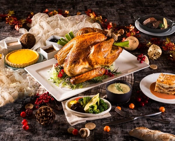 The Lounge大廳酒吧必買明星商品「JC Cat雙人下午茶餐券套組999元」,全年最低優惠價,共有24品好吃又好拍的各式點心及2杯飲品,就能享受一場美好的下午約會;「萬怡火雞禮籃超值組合3,999元」有6公斤以上的美國進口火雞,採用獨家配方醃製爐烤,表面金黃油亮,肉質鮮嫩多汁,還有美式燒烤BBQ豬肋排、和牛肉醬千層麵、栗子南瓜派、美國碳烤肯瓊風味紐約客牛排等豐盛餐點,擺上派對餐桌絕對超有面子。