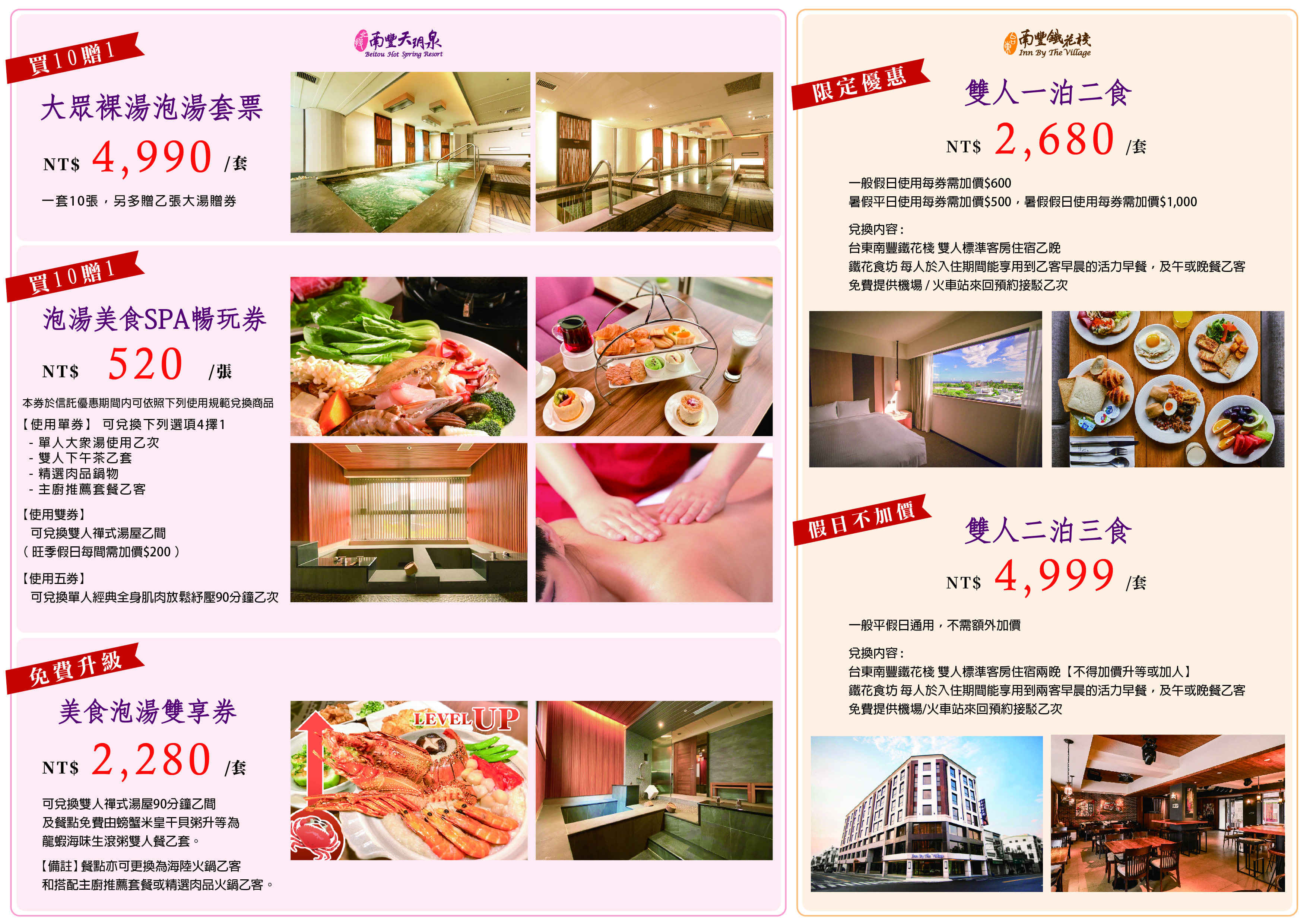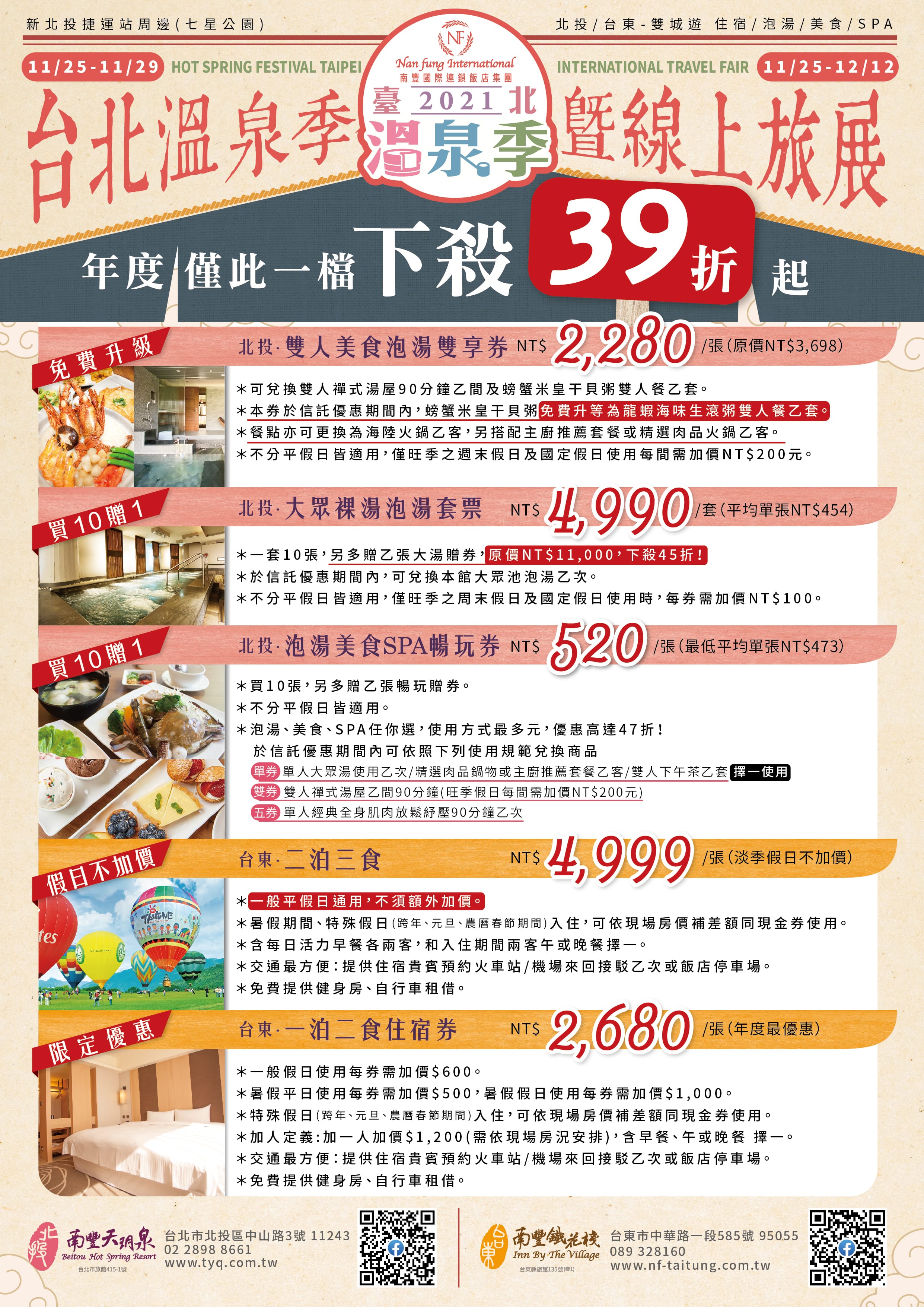 【南豐國際連鎖飯店集團】火力全開卯力激催買氣,自辦『線上旅展』日期與『台北溫泉季』11月25日同步開跑,直至12月12日,《北投南豐天玥泉溫泉會館》湯泉美食商品聯合《台東南豐鐵花棧》下殺高達39折的住宿券,年度線上與兩館現場祭出優惠獨賣18天,鼓勵不喜歡現場人擠人的消費者也可以直接線上輕鬆購買,活動詳情請洽業者或官方網站。