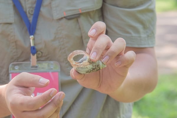 生態走讀是一條專為親子活動所設計的生態探索遊程,想像自己是福爾摩斯,在森林裡發現童趣。生態走讀有日場與夜場兩種不同玩法,各能領略森林白天與夜晚的生態之美。跟著有多年生態教育經驗的高賀老師漫步森林湖畔間,透過啟發式的生態觀察,喚醒大人小孩對大自然的好奇心。「你覺得這些蝸牛是怎麼死的?」老師拿起兩具蝸牛殘骸問道。透過現場遺留的蛛絲馬跡,猶如偵探般推理解謎,分別為陸生螢火蟲及白鷺鷥所食,就是一例。不論是夜場的生態走讀,亦或工作假期的冒險夜觀,在越夜越美麗的林後四林棲息地中發現,森林之夜是美麗的!