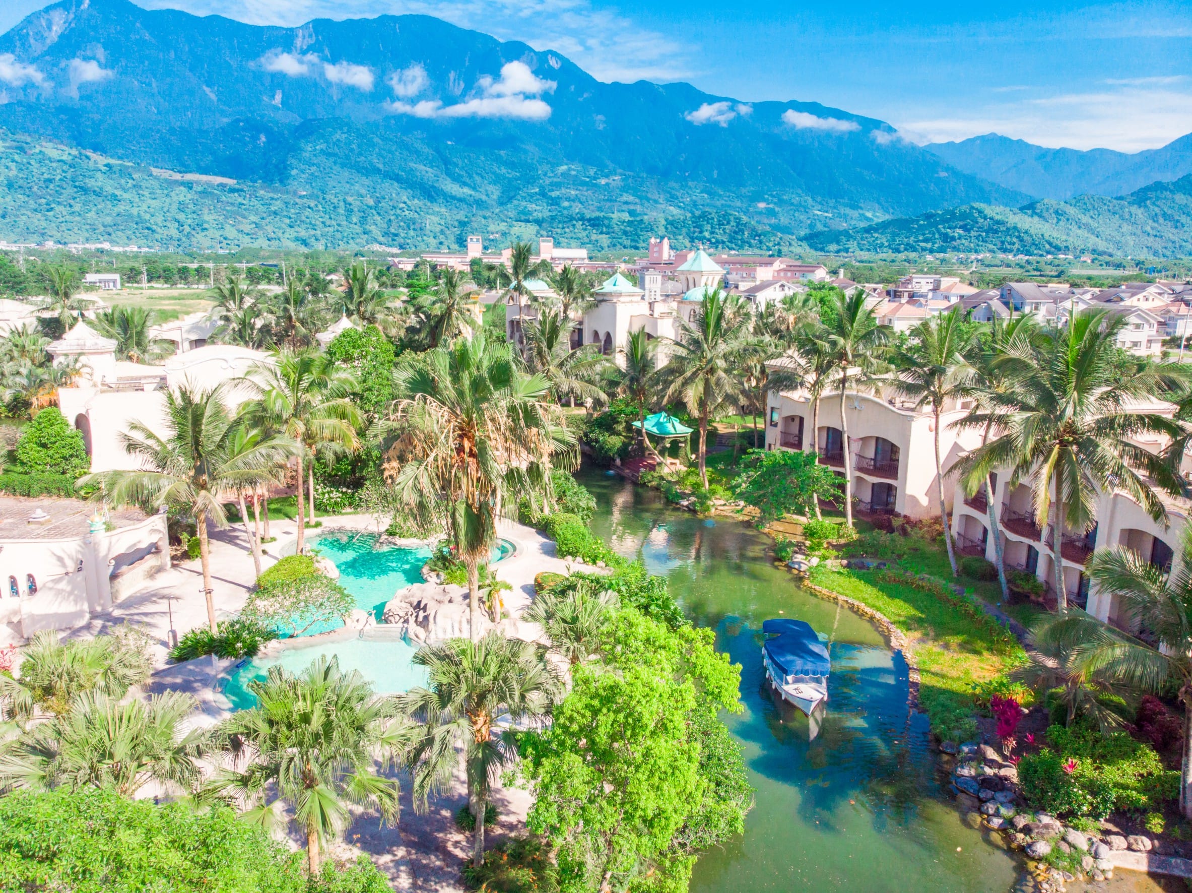 西班牙建築設計風格的獨棟別墅,擁有花蓮潔淨空氣、水加上萬坪森林公園環境,以綠飯店的概念兼顧環保與生態,萬坪綠野與運 河環抱22棟低樓層景觀別墅,每間房皆具備迎山面河的視野,漫遊 園區16座橋樑與三座島嶼,處處皆是截然不同的類出國渡假感受。 「獨島、獨棟」的住宿,區域分屬於最寧靜的大島,出房門一分鐘 就能接觸水岸,呈現大自然的生態之美,別墅前的泳池坐擁在運河旁環抱自然景觀,池畔躺椅觀覽美景。