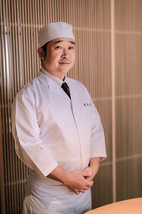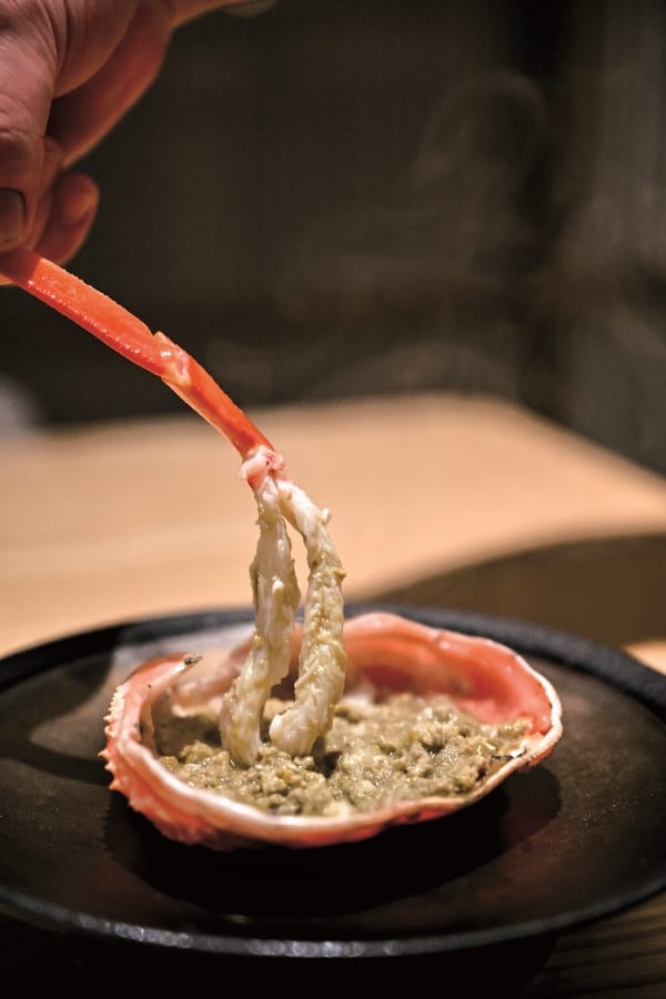 捕獲上來的新鮮活體「隠岐松葉蟹」進貨量極為稀少,「月夜岩」於去年12月上旬至2022年1月下旬,盛情推出「隠岐松葉蟹懷石」,每人12,000元,由福島料理長於包廂內親自桌邊料理,細細剖蟹、烹調、去殼至裝盤上桌,從食前酒、先付、椀物、強肴到「隠岐松葉蟹」六吃,最後收尾的甘味,完美演繹舌尖上的極鮮滋味!其中一吃是刺身,將蟹腳肉取出後放入冰水裡冰洗,再以松露、魚子醬、柚香醋、紫蘇花調味,肉質軟嫩鮮美。川燙,松葉蟹腳以高湯涮一下,簡單就很美味,甲羅燒是以蟹蓋當盛器,將蟹肉與蟹膏置入殼中在烤網上烤熟,交織成柔軟濃稠海味。還有獻上被稱為冬季紅色寶箱的「香箱蟹」,即松葉蟹的雌蟹,每年可捕撈的期間僅冬季不到三個月時間,受歡迎的不在蟹肉,而是可一次享受內子(蟹黃)、外子(蟹卵)的豐富口感,調理後粒粒分明帶有彈性口感,被稱為海中珍味。