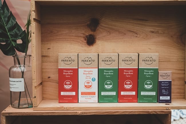 「Para’Kito法國帕洛」的PMD防蚊全系列產品包裝時尚、用色活潑鮮明,正說明法國人擁有自己的時尚品味,將防蚊融入在生活中,變成一種展現自我的生活態度。PMD防蚊噴霧採按壓式霧化噴頭設計,噴灑在肌膚上清爽不油膩。萃取自植物的天然PMD防蚊成分,結合ClayCell-Complex™專利技術,使用礦物和植物纖維作為黏合劑,能夠減少防蚊活性物質滲入皮膚,同時提高時效和安全性。紅色的「天然精油強效防蚊噴霧」,是市售最長效的天然防蚊液,長達10小時防護,適用對象為成人、3歲以上兒童、蠶豆症,孕婦不適用。綠色的「天然植萃長效防蚊噴霧」,有8小時防護作用,成人、孕婦、6M以上嬰幼兒、蠶豆症可使用。