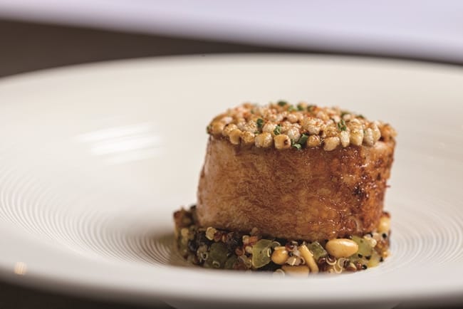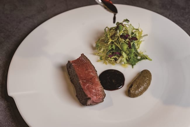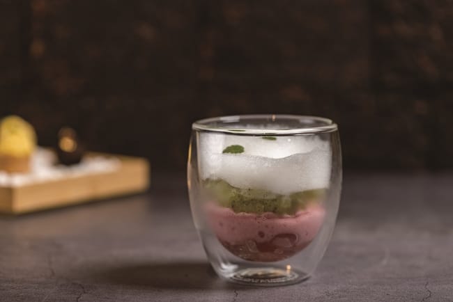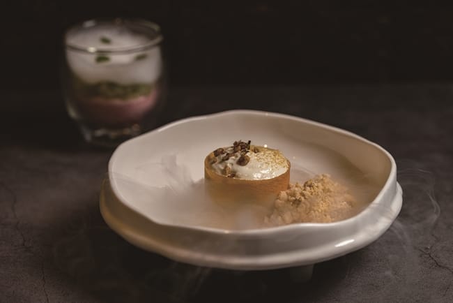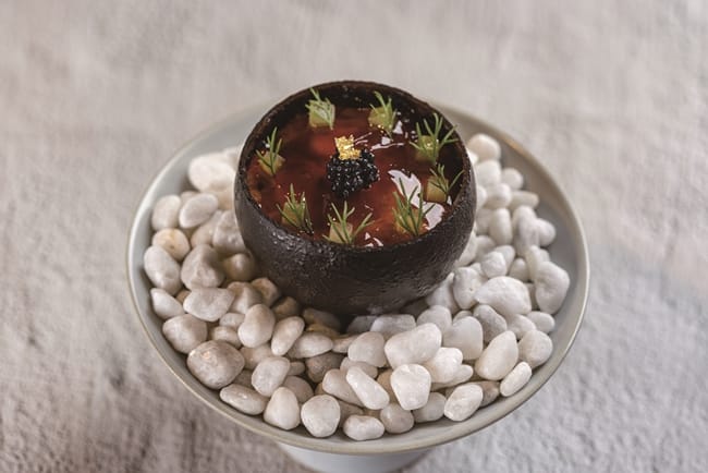 美國PRIME等級的菲力牛,五分熟熟度和宜蘭三星蔥打製成的泥、阿里山山葵泥,在盤中口味激盪。而採用紐西蘭6個月以下的小羔羊製成的羊排,薄荷青豆和迷迭香的肉汁,活脫就是一套適合春天享用的佳餚。甜點如藝術,視覺和味覺雙享受餐如此,甜點依然。豆腐、豆漿、焦糖醬油,在學藝術起家的甜點主廚戴宜庭手中,幻化成藝術作品,「以前拿筆畫圖,現在用夾子拿食材,都是完美的雕塑」,打破了甜點是套餐句號的迷思,而是十道菜中前、中、後韻的串聯,一氣呵成這道三位主廚聯手打造的春料理。
