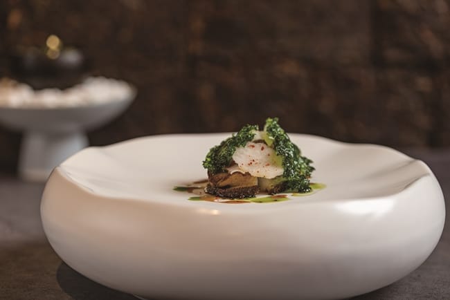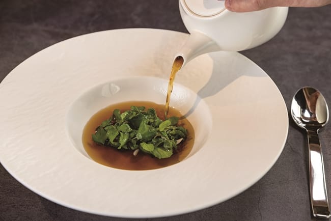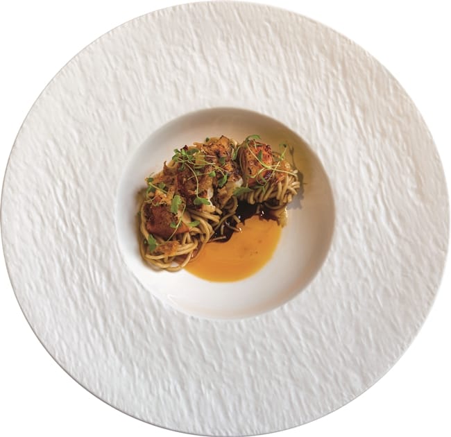 近八成的食材源自這塊土地,是我們最熟悉的味道,再從味道中去翻轉手藝,為傳統的古早味營造出新浪漫。台灣的桂丁雞搭上鴨肝、紫蘇梅,鋪上藜沙拉、松子,用紫蘇梅平衡了鴨肝的油膩感、蕎麥的脆口感。單一菜色的口感平衡,其實,也鋪陳了主廚在整套套餐中的平衡手法,見微知著。非常親民化的乾麵,配上龍蝦,台灣味與法式料理碰撞出餐飲火花,這道餐營造了高貴化,卻又給人距離不會太遙遠的在地性。牛舌先醃上一天、再慢燉到軟化,醃製的時候加上青花椒,保留了青花椒的麻味、少了辣味,在淋上猶如台南特殊地方名物的生牛肉湯的清燉牛肉湯湯品,呈現的是「南方風情」。