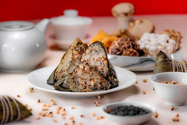 圓山當然也準備素食可吃的端午粽,有「黑松露百菇素粽」及圓山最經典的「紅豆鬆糕粽」。集結珍貴松露蕈菇醬與帝王菇、猴頭菇、花菇、黃金蟲草菇等多款菇類的「黑松露百菇素粽」,以松露及菇類獨特香氣與豐富內餡,滿足您對素食的口感。