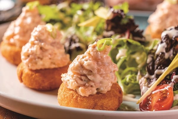 結合經典義大利菜及法國菜,JK以豐富多樣的排餐聞名,Jerry特別強調JK的食材與星級飯店、米其林餐廳同等級,透過廚藝團隊掌握食材特性,呈現美味的料理樣貌,不做過多的調味,例如將香煎爐烤好的牛排靜置回溫的手法,才能保有完美熟成度的正統西餐文化。 因此想要給對方一個難忘約會,推薦經典雙人套餐,光是第一口品嘗明太子法式麵包就令人驚艷,酥脆法式麵包抹上主廚特製明太子醬後烘烤,表面帶有焦香口感。開胃的三道前菜擇一,馬鈴薯燻鮭魚是以炸過的馬鈴薯餅加上塔塔醬燻鮭魚沙拉搭配清脆生菜。