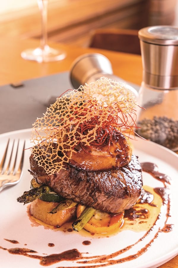 主食有6道可任選,其中考驗主廚功力的噶瑪蘭戰斧豬排帶有微微炭烤香氣,肉質細緻鮮嫩,肉汁豐富且充滿甜度,附有特調醬料、普羅旺斯燉菜、醃漬珍珠洋蔥、葡萄乾、薯條等配菜。法式小羔羊排特選紐西蘭小羔羊,沒有羊羶味,鮮嫩多汁,大口吃好過癮!經典羅西尼和牛菲力,層層堆疊松露、頂級鴨肝、日本和牛菲力、碳烤季節時蔬,再以特製醬汁調味,以上兩款皆附有法式傳統的紙包魚海鮮料理,誠意十足。當然想要嚐嚐JK最著名、重達42盎司,視覺超震撼的美國極黑戰斧牛排也可以加價換,細細咀嚼彈性肉質、均勻軟嫰、肉汁Juicy,絕對值回票價!