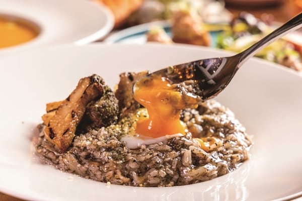 百里香西芹培根炒野菇佐義大利香料調味、香氣十足。炸魔鬼雞翅被國際知名旅遊網站Big 7 Travel的秘密客挖掘,獲選全台北最優秀雞翅之一,微辣中帶著酸甜、欲罷不能。黑松露野菇燉飯完美融合泰國米與壽司米,加入濃郁黑松露醬,再將水波蛋均勻拌入又將美味更提升,還有每天的主廚特製湯品,也很讓人期待。