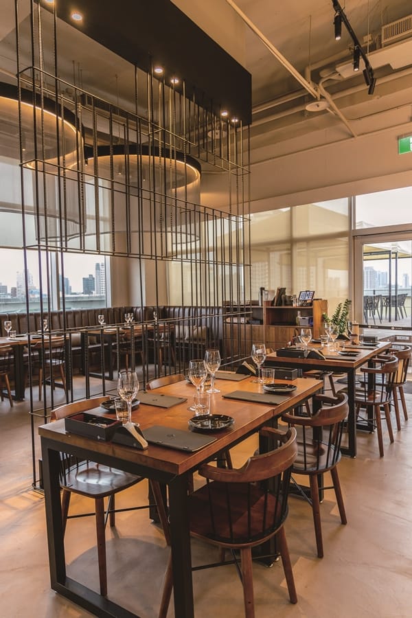 Jerry形容「JK STUDIO義法餐廳」是一間很〝帥〞的餐廳,「從環境、餐盤至 菜單設計,我們不迎合時下流行的網美風,整體採線條簡單、色系單一,以英式輕工業融合新古典時尚,講究獨立個性及質感,又巧妙以天花板延伸下來的曲線紗簾更增浪漫優雅,與局部鐵件呼應形塑衝突美感。」用餐空間挑高寬敞舒適,落地大窗迎來明亮光景,規劃有吧台區,牆面延續信義店的文化石牆,以及歐式酒窖風格的獨立包廂,酒標木板牆面很有特色,更難得是擁有戶外露天區,如置身國外的感覺,很適合情侶談心約會日常。