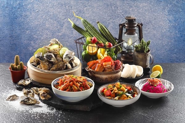 全國最高自助餐廳「50樓Café」地點絕佳,位於板橋大遠百旁、新北地標百揚大樓的頂樓,全廳360度環場視野,美景無敵!初夏時節,50樓Café將自5月20日至6月30日的每週五至週日推出「澎湖海鮮吃到飽」,主廚特選尚青的海產,如帶殼牡蠣、火燒蝦、紅新娘、章魚、小卷、紅蚵、九孔,同時也蒐羅了當地名物,像是石鮔乾、飛魚卵香腸、西衛麵線以及仙人掌果…等,以琳瑯滿目的佳餚美點,讓來客在味蕾舌尖神遊澎湖!
