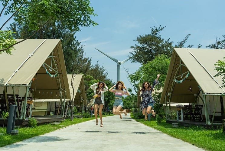 《向海那漾》位於大安濱海樂園內,緊鄰湛藍海岸,每房帳篷皆配有戶外座位、鞦韆,提供遊客吹吹海風、曬日光浴,別有異國渡假的愜意。除此之外,園區裡也擁有多項設施提供遊客,包括豪華露營區、大草皮遊戲區、生態導覽空間、DIY體驗、戶外戲水池,以及景觀餐廳和輕食咖啡等等。 在吃食部分,《向海那漾》所推出的一泊三食是頂級饗宴,除了入住時段奉上悠閒下午茶以及隔日早餐buffet,晚餐更是豪華火烤兩吃BBQ晚餐buffet,有麻辣鴛鴦鍋的麻辣療癒味蕾,也能享受師傅現烤牛排、各式串烤的大啖快感。這次的國旅專案更免費提供一杯生啤酒,讓遊客在夜空下,與夏夜蟲鳴乾杯!