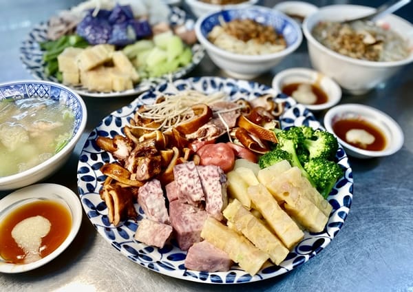嘉義人喜歡的早餐還有類似黑白切的魯熟肉,將各種食材汆燙後保留原味,再沾蒜泥醬油和甜辣醬享用。熱門老店「菜鴨魯熟肉」除了供應魯肉飯、米苔目、米粉湯和乾麵,攤位前琳瑯滿目的魯熟肉,從豬皮、豬肝、粉紅腸到芋頭、蘿蔔、花椰菜、筊白筍應有盡有,其中又以肥豬肉、荸薺、芹菜、麵粉和蛋攪拌後蒸熟的「蟳粿」,滋味最特別。