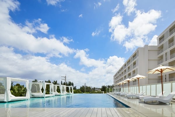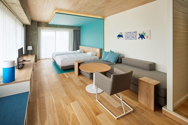 BEB5 沖繩瀨良垣共有7種房型,可容納一至五人,包括一般套房、三人房、愛犬房、無障礙房型等,皆為配置廚房和洗衣房的公寓式住宅。旅客可前往附近商店和超市購買食材做料理,在沙發上悠閒放鬆,度過愉快的時光。同時館內設有能感受海天一色的無邊際泳池,泳池旁的西式涼亭及躺椅更加增添海島度假氛圍。