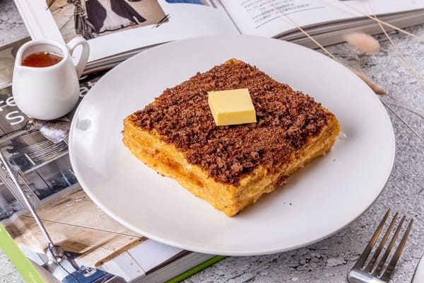 從麵糰開始自製的「冰火菠蘿油 80元」,菠蘿表皮的厚度比一般麵包店的酥皮比例稍高,整體甜度和奶香更加充足,光看就能感受到香酥,甚至連牛油也增加三分之一的厚度,奶油融化速度和完食的速度差不多,完全不會浪費一滴奶油。進階版的「叉燒菠蘿包 120元」,在菠蘿包裡面放上楊師傅特製的蜜汁叉燒與一顆半熟蛋,當金黃色的蛋汁流過叉燒,夾著菠蘿包一起食用,蛋的滑順和香氣 、加上叉燒的香甜與菠蘿包的香脆,口感層次豐富,是一種全新的滋味。