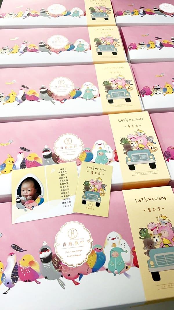 主打灌餡蛋捲的「青鳥旅行」,受消費者喜愛的原因不僅是蛋捲口味多變化,還有三節推出的新穎具獨特性的設計禮盒。這一次,青鳥旅行結合孟耿如送給女兒的第一張NFT創作「螢光粉紅熊」,以「全家總動員:守護黃玉米!」為設計理念,凝聚了夫妻兩人所飼養的寵物成員們。利用手繪圖騰的形式,呈現寵物成員開車迎接寶寶的加入,再以古銅色燙金法,於童趣細節中蘊藏著低調奢華,亦象徵著「期盼、和諧與力量」。