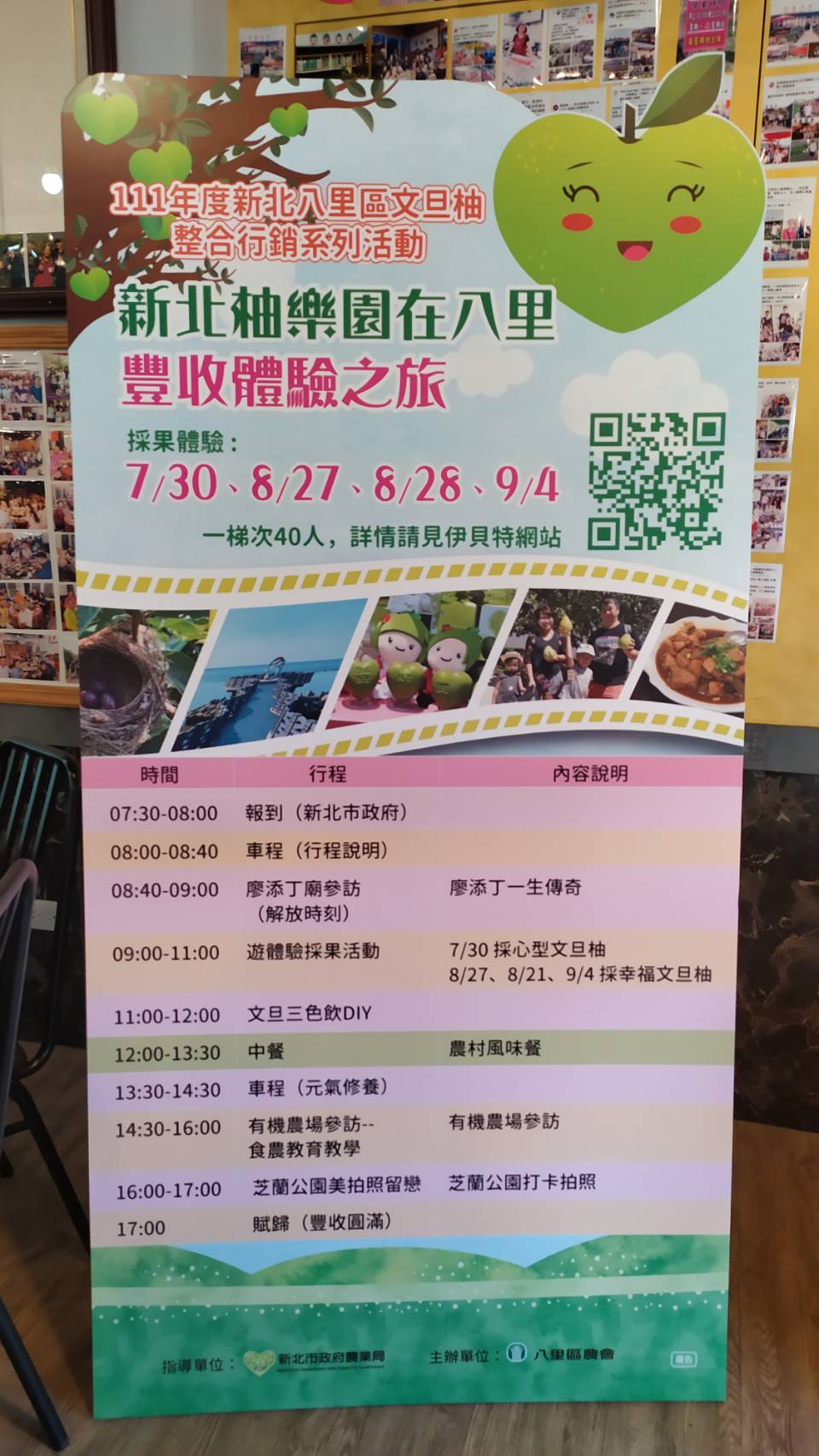 廖添丁廟 (廖添丁一生傳奇)→體驗採果活動 (8/27、8/21、9/4採心型文旦柚)→文旦三色飲DIY→中餐 (農村風味餐)→有機農場參訪(食農教育教學)→芝蘭公園美拍照留戀→賦歸