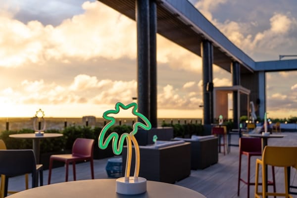 而酒店話題性十足的賣點之一就是位於頂樓的空中酒吧 – 晴空酒吧 Sky Bar,即將於今日(7月27日)正式開幕迎賓。晴空酒吧於酒店開幕之際即引起廣大的詢問度及討論焦點。號稱台南最高的空中酒吧,佔地150坪,共80個座位。以玻璃磚、霓虹燈等選材延續一貫現代繽紛的設計風格,相襯甲板般的木紋地磚、麻繩圖樣抱枕、有著趣味帆船圖案的霓虹燈帶出海洋相關元素,將Aloft的樂活精神帶入安平港的古都人文,活力中又帶點沉穩愜意,希望來到這裡的旅人都能享受音樂及調酒,踏著甲板、乘著海風、航向海景,感受旅程中最放鬆的時刻。此外,臨近安平港,享受一望無際的開闊視野,可鳥瞰漁光島、德陽軍艦、觀夕平台、安平港及安平老街等觀光景點。前方無任何遮蔽的得天獨厚條件,讓台南安平雅樂軒酒店的晴空酒吧成為台南最高的空中酒吧,也是可欣賞黃澄澄的夕陽美景搭配安平港無敵海景的最佳打卡熱點。而喜愛攝影的人應該都對於Magic Hour這名詞不陌生,所謂的魔幻時刻,就是每當傍晚日落時分、日夜交替之時,夕陽的霞光渲染了整片湛藍天色,將天空染出艷紅晚霞的絕美景色,如同陷入一種魔幻空間,讓人目眩神迷。打造仿美國度假勝地邁阿密的休閒度假愜意氛圍。開幕迎賓送好禮!