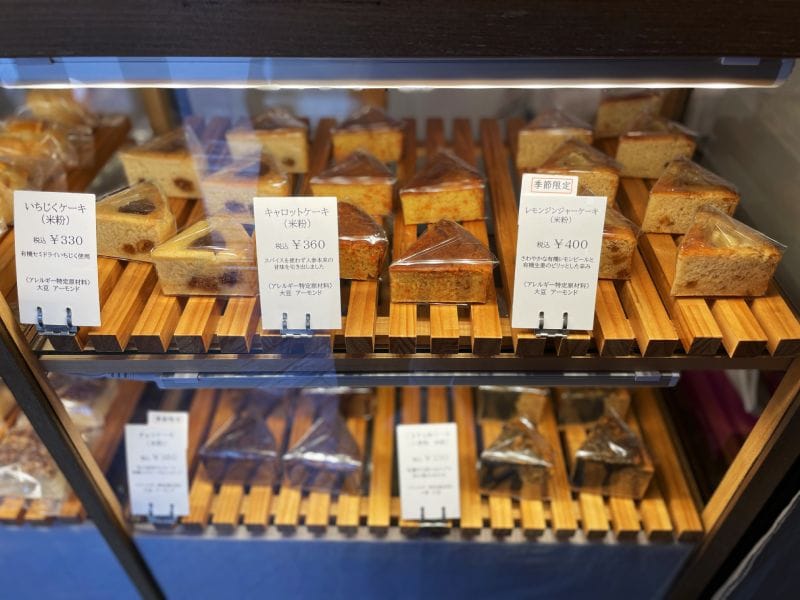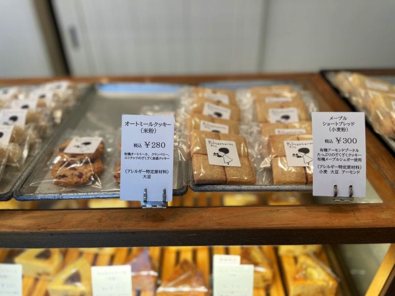 特別值得一提的是,這裡的甜點食材相當講究,有標榜著不使用小麥粉、蛋、奶所製成的餅乾和蛋糕可選擇,仔細看商品上標註的原料,發現使用的多是有機食材,且會以甜菜糖代替白砂糖,和一般的甜點相比,讓人能吃得更無負擔更安心。 ※疫情期間視情況可能僅提供外帶服務,前往時請注意官網資訊。 這次選了以米粉代替小麥粉的蛋糕和餅乾