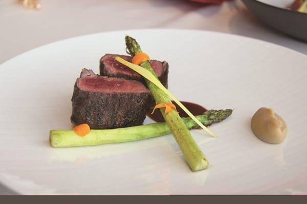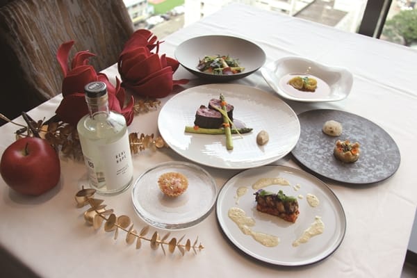 8月7日節氣「立秋」,「浮雲客棧」頂樓的LCM萊可曼法式餐廳,以全新秋料理饗客,在高樓層視野極佳、位置寬敞的空間中,享用主廚洪正育精心打造,將不少台灣在地食材融入法國料理,幸福感油然而生。在法國料理中,秋天會吃野味,主廚選用鹿肉當此季主餐,以紐西蘭鹿肉中的菲力部位為主,一個鹿肉的菲力大約只能做兩客,相當珍貴。七分熟的鹿肉配上龍眼醬汁、栗子泥、蘆筍、食用花,展現本季主角「爐烤鹿肉搭白蘭地栗子泥佐龍眼醬汁」。