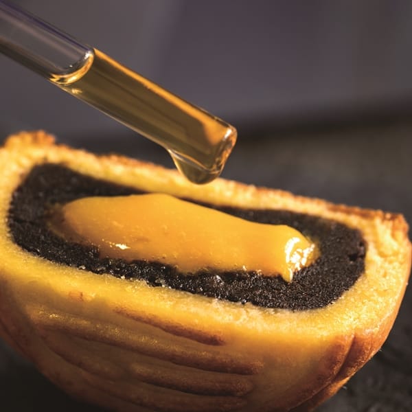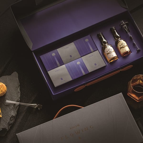 開璽不單單只是把威士忌加入糕餅內餡這麼簡單。在內餡中,結晶化的威士忌融入焦糖化的巧克力中,兩者互相提味。餅本身則帶著牛奶糖及豆沙的前香、葡萄乾的中調,以及龍眼乾的後韻,在威士忌的襯托下,更加彰顯;更厲害的是開璽招牌的流心並沒有缺席,將威士忌原酒包入餅內,以高溫縮時的烘焙工藝保留了真酒風味。但,這還不夠,在「醉是流心」3款禮盒中,分別附上了玩家級滴管、聞香杯,或國人普遍喜愛的波本/雪莉桶威士忌,消費者可依照自己的喜好,以滴管將威士忌滴入內餡、流心中或餅皮上,增添風味,亦添儀式感;一口餅,一口酒也十分過癮;三五好友更可以交換自己喜愛的威士忌,自行創意發想新吃法。如果小酌可成為日常生活的調劑,品味的象徵,紓壓的方式,或是好友歡聚時的助興飲品,那與結合威士忌的糕餅也可以。