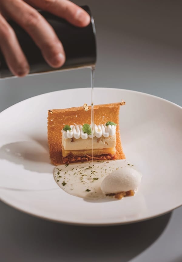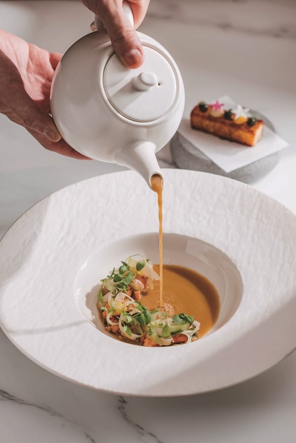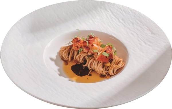《日常》主廚從乾拌麵發想得來,法式龍蝦醬汁加入柑橘香料辣油、甘甜醬油融入手工拌麵,加點飽滿龍蝦肉、酥炸櫻花蝦,可說是法式與中式料理的完美結合,成為人氣招牌菜。甜點主廚戴宜庭Miranda精心勾勒粉紅《夏天》概念來自西瓜汁,將黑美人西瓜元素變化成冷湯、果凍、糖漬味,灑上馬告胡椒提味,搭配羅勒冰沙,微酸香草氣味是專屬夏日的清新。《融合》以鹽麹醃漬的鳳梨再用奶油微煎搭配蘭姆酒芭芭,巧妙妝點椰子片,來一球淋上香茅醬汁的桂花冰淇淋,散發酸甘鹹甜多層次風味,像極了令人醉心的夏日戀曲。尾聲的茶點,佐一口柔軟的柑橘焦糖泡芙,清新玄米茶甘納許的達克瓦茲,再細細品茗「采采食茶文化」的茶飲,為今晚的法式饗宴留下悠遠美好印象,值得回味許久⋯⋯