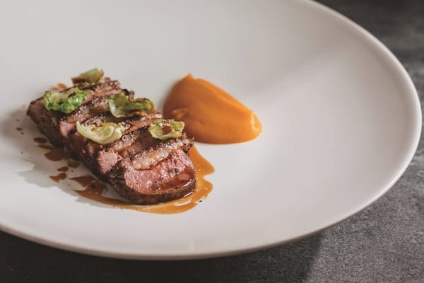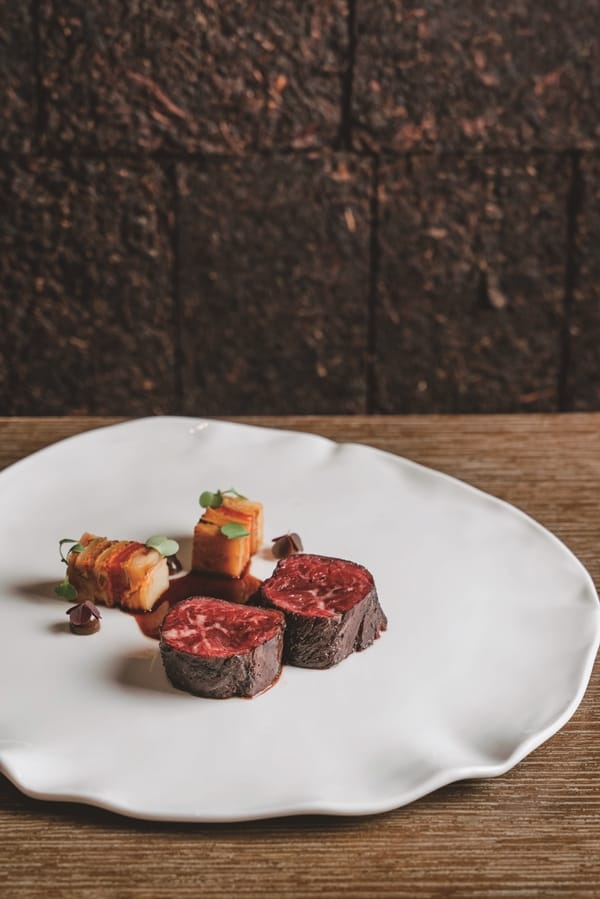 料理當畫布,《水果》描繪出盛夏的鮮明豔麗,北海道干貝上灑一點粉紅胡椒、青富士蘋果片、一抹黃色百香果調製成的油醋醬汁、綠色蒔蘿油,這畫面美極了!《南邊》將法國最具代表的馬賽魚湯結合酸脆的台南西瓜綿意外的很合,配料為海草蝦、馬祖淡菜,再融入番紅蒜味美乃滋、茴香泥、山當歸葉油,搭配法國魚子醬麵包,交織出豐富的味覺層次。《川味》呂柏翰Louis主廚發想自川菜酸菜魚,將黑豆石斑香煎後,佐東西方臘腸做的肉醬、煙燻番茄、油波辣子、傳統修隆醬汁、蚵蠣泡沫提鮮,麻辣酸甜各種吃法挑動味蕾多滋味。《經典》重新詮釋,主菜爐烤彰化胭脂鴨表面先刷過麥芽糖與醋調製的醋汁再進烤箱,糅合花椒肉汁、自製黑胡椒、八角、香草籽、青花椒等四香,風味更濃縮,佐柑橘蘿蔔泥解膩,肉質鮮甜軟嫩、濃郁豐美。另一主菜靈感來自夜市的黑胡椒牛排,特選澳洲和牛橫膈膜,以印尼爪哇胡椒、柚子胡椒、日本山椒做成的醬汁調味,突顯牛肉香氣,再以2至3次不同的香料油澆淋,濃郁豐美的牛肉美味,由內而外漫延整個味蕾,擺上蔬菜千層,更增自然風味。