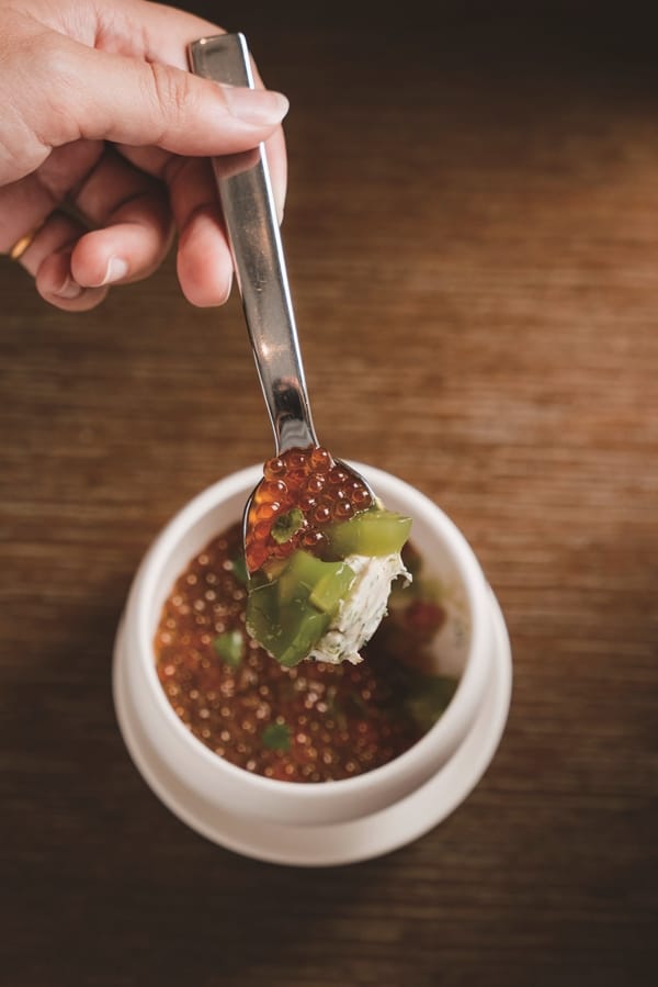 置身摩登質樸而充滿雅韻的CHA CHA THÉ Cuisine,迎賓小點炙燒鮪魚塔帶來小驚喜,自製塔殼置入帶點酸豆的葡萄泥、炙燒鮪魚加上山葵美乃滋及煙燻魚子醬、清爽開胃。每道菜賦予主題,開場的《法國》是劉子豪Leo主廚在南法留學學會的第一道法式料理,充滿鮭魚卵海味、爽口小黃瓜凍滋味、法式白乳酪混和4、5種香草的奶油味,又略帶苦味的糖漬柚子丁,畫龍點睛的香蜂草帶有柑橘香氣,馬鞭草油讓尾韻延長,組合出專屬南法的美好記憶。