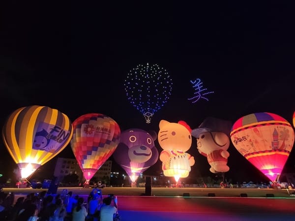 隨著音樂響起,300架無人機群從熱氣球後方逐漸登場,在夜空排列出各種閃亮圖樣。先以「Hello Taitung」作為開始,接著陸續呈現出「Hello Kitty」、「金樽衝浪」、「最美星空」、「乘風而騎」、「知本暖湯」、「成功曙光」、「舊站百年」等代表臺東意象的圖案,並以臺東品牌「真、善、美」絢爛奪目收尾,現場觀眾滿滿感動,驚呼「台東真美!」