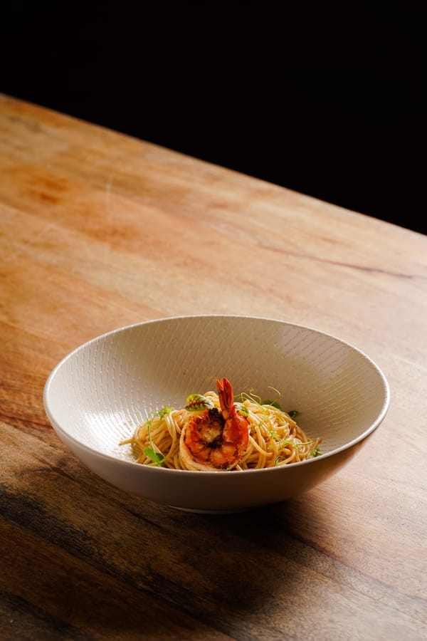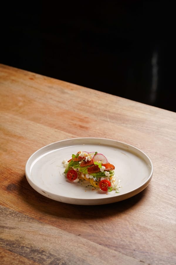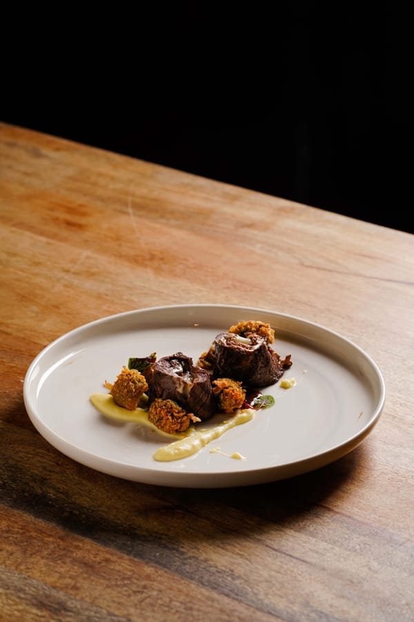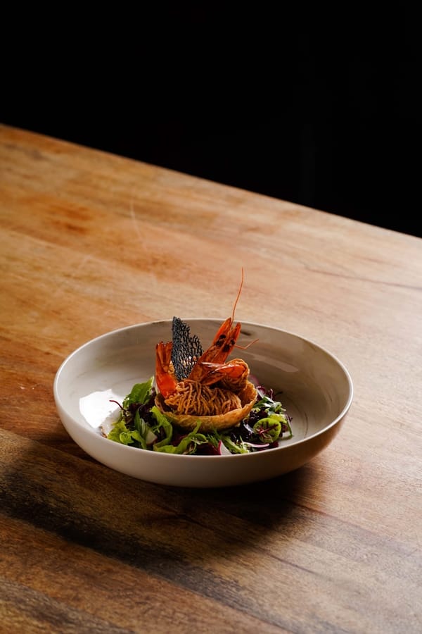中西合璧的烹調手法一直是時下趨勢,在此次的菜單裡,徐晨翔(Sean)的台灣烏魚子鮮蝦酪梨沙拉即是以台灣在地食材融入西方菜式,林承翰(John)的酥炸米線蝦搭哈里薩醬則改良中式米線蝦,連家輝(Jeff)的香煎和牛結合鹹蛋與西餐常見的洋芋泥,襯托肉質的軟嫩。