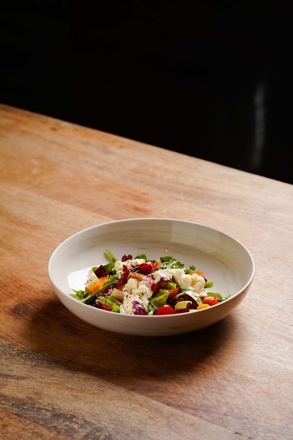 鄭昇耀(Jeffrey)的布拉塔起司番茄沙拉嚴選義大利經典乳酪布拉塔(Burrata),外層與半融內餡具有雙重的起司口感,與新鮮菜蔬和醬汁相襯,更能夠突顯食物本身的特色。