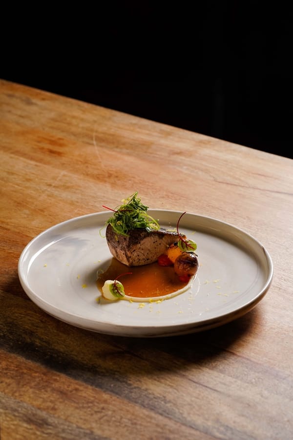 溫凱珊(Kenji)的爐烤青甘,則是改變大多數生魚片、烤下巴、照燒、燉煮等方式,用爐烤表現其肉質緊實和油脂豐潤的特質,搭配爽脆的清炒龍鬚菜,最後淋上柚子醬汁提升青甘的鮮甜。