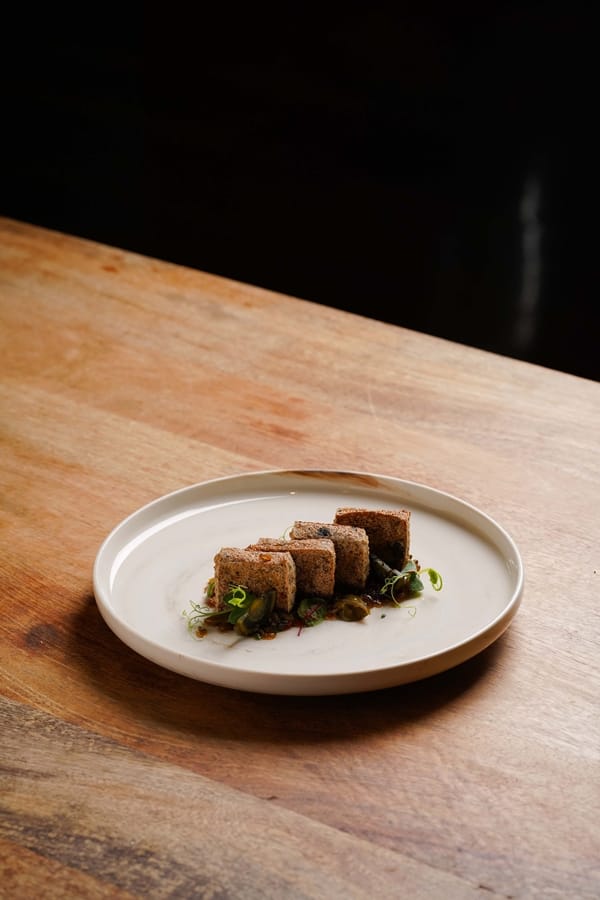 曾姵蓉(Pei Rong)的酥炸中卷溫泉蛋溫沙拉,考慮到現代人講求營養均衡,以溫沙拉作為發想,同時融合自己故鄉台南的飲食習慣,製作時加入少許甜味的元素,讓料理層次更為豐富。