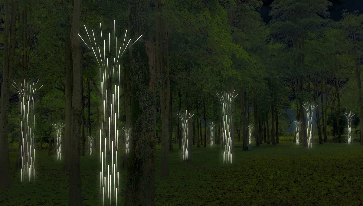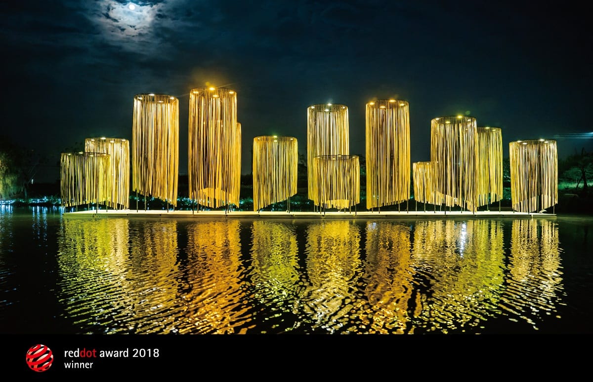 隨著「南藝大建築所 B 群」搭起的長廊走進星星草原,觀者得以躺在形如泡 泡錯落層疊的圓形大平臺《讓我們圈在一起》仰望星空,欣賞法國團隊 Groupe LAPS 的動態聲光作品《Keyframes》(關鍵影格),百個燈泡人形在夜幕中相互追逐,跨越國境和語言傳遞歡欣而溫暖的心意;「有用主張」汲取遠方白玉瀑布之靈感,化作茂密林間流動的《金勵湯》。一場光祭,引領觀者沐浴在山林包覆的大型浴場,感受面向未來的科技藝術,也以快慢有致的燈光藝術、時空交錯的景致,為知本添加活力與能量的多元風貌。