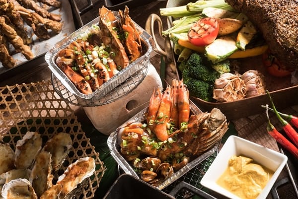 「海陸燒烤饗宴」由詢問度最高的海鮮料理拉開序幕,將蝦蛄尾、草蝦、透抽、花蛤等綜合海鮮,以錫紙高溫燒烤方式,完整鎖住鮮甜海味,假日再加碼松露焗烤鮮蠔、鹽烤香魚、鮭魚卵手捲與磯煮鮑魚等美味料理,滿足一眾海鮮控的味蕾。現切肉品區則是提供鮮嫩多汁的美國燒烤牛排、甜辣交融的紐澳良風味燒烤豬肉,假日則提供美式燒烤豬肋排,也讓肉肉控大飽口福。