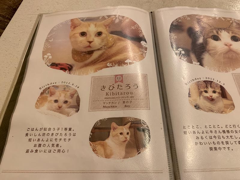 每隻貓咪的名字、個性都不一樣,可以翻開擺放在桌椅上的介紹資料認識一下!