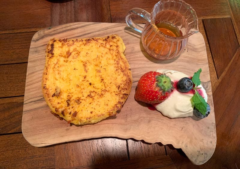 店家的招牌甜點法式吐司,外型做成貓型圖案,極具巧思,非常可愛又好拍。吐司外層經烘烤後呈金黃酥脆,帶有微微焦香,搭配附上的糖漿與鮮奶油,甜度剛剛好。吐司口感鬆軟嫩滑,幾乎不用咀嚼就入口即化,剩下濃濃蛋香在口腔裡蔓延,跟富含酸甜滋味的草莓和藍莓一起品嚐,令整體味道更添清新可口,無論大人還是小朋友都會一吃就愛上!