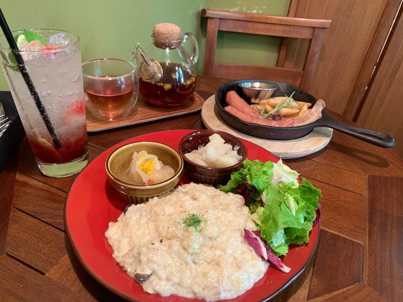 除了甜點,店家也提供各種餐點與輕食,像這次到訪就點了義式雞肉香菇燉飯,濃稠狀米飯口感細緻綿密,散發濃郁奶油香,搭配肉食控必嚐的帶骨肉腸,美味可口。口味濃郁的料理當然是跟清爽飲料最搭配,而店家有多款果茶、果汁、碳酸、甚至酒精飲料可選擇,讓遊客可以盡情飽餐一頓。