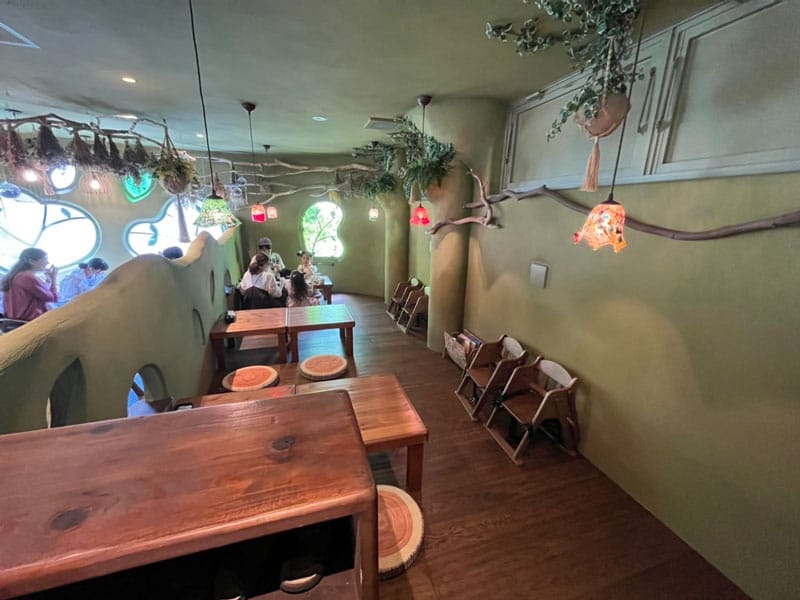 咖啡廳「TEA HOUSE Habba」(TEA HOUSEはっぱ)門外被村內的綠草植物簇擁,店內桌椅和裝潢皆以木材為主,處處佈滿乾燥花的裝飾,仔細一看連門口的扇窗也是葉子形狀,宛如走進童話裡的森林小屋。店家的菜單也相當豐富,推薦來這裡享用下午茶或吃午餐,度過悠閒的午後片刻。
