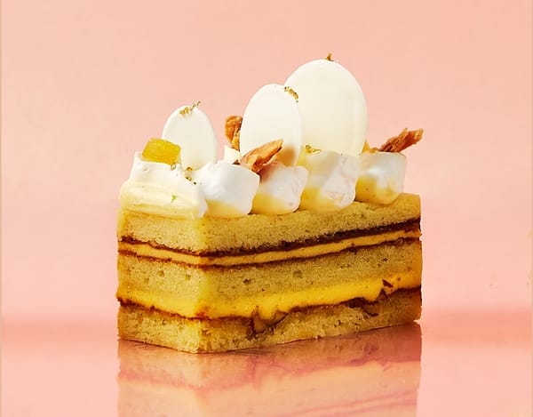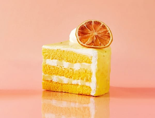 推薦喜愛挑戰味蕾的甜點控「生薑檸檬」(單片180元),以層層堆疊生薑與粉紅檸檬所製成的海綿蛋糕體,並加入杏仁碎粒提升口感,上層日本北海道奶霜,搭配以糖霜烤至金黃的杏仁片,獨特組合卻沒有辛辣的薑味,和諧的比例反而釋放出更誘人的口感。