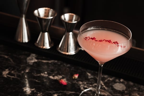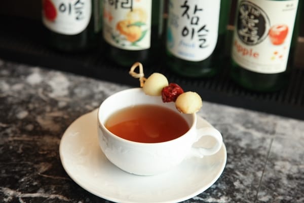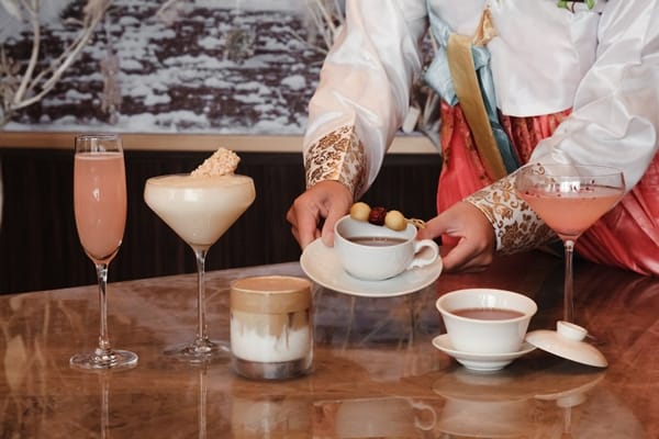 「胭脂裙帶」以琴酒、苦艾酒為基底,微微苦澀中帶有細膩清香,如同胭脂般的粉嫩顏色,玫瑰花瓣就像韓服裙帶般美艷動人。另有宛如冬季雪景的「馬格利雪寶」,以韓式燒酎、馬格利米酒為基底,並添加台灣米釀,綴以新鮮香蕉、椰子、肉桂,配上台灣傳統零食蹦米香,清爽呈現台韓合璧的完美調酒。