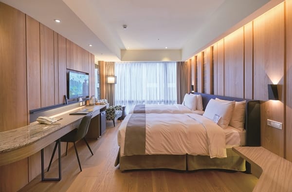122間精緻溫泉客房,洋式、純日式或和洋式房型,一大床或雙人床、四人床位皆能滿足旅客需求。整體現代簡約空間設計融入自然元素,運用大地、木紋、稻穗等色調,以及噶瑪蘭族的香蕉絲編織文化,營造出溫暖禪意感覺,從大面窗就可欣賞繁華礁溪鄉或遠方蘭陽平原與龜山島。
