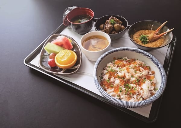 美湯加美景、美食,在頂樓景觀餐廳「米澤廳」視野遼闊,佐龜山島與蘭陽平原日夜美麗景致,以套餐創意料理為主,嚴選宜蘭當地新鮮食材、小農時蔬和山形縣特產。晚餐美饌延續大受好評的秋蟹四重奏,至年底前推出《冬蟹三重奏》季節限定,包括鮭魚卵蟹肉雜糧炊飯,滿滿梭子蟹肉撒在香Q的台梗九號米與藜麥雜糧上,搭配鮮甜鮭魚卵與蝦夷蔥,澆上濃厚蟹黃醬,份量不小的濃醇蟹黃醬佐冬蟹鉗,以及蟹肉海帶芽味噌湯、日式板栗燉腩排、季節彩繽紛,再喝上一口暖心薑米茶,每一口都滿足。