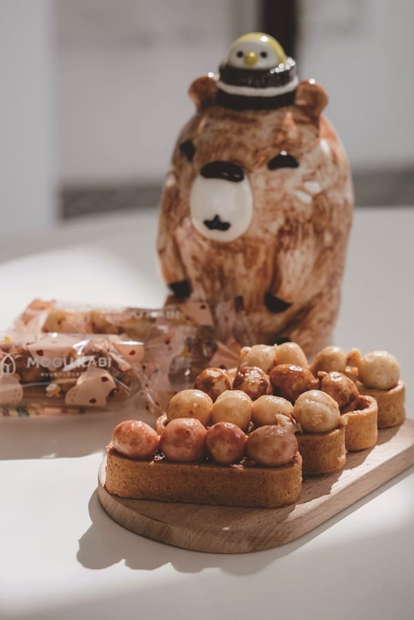 但進入店內怎可能空手而回呢?瞧這獨特的豆塔造型很吸睛,有別於一般圓形外觀,MOGU KABI夏威夷豆塔為獨家研發方便入口的長條外型,可以吃得優雅不用擔心碎屑掉滿地,烘烤得酥脆的塔殼是以法國AOP產區認證奶油製作,使用澳洲特選A級夏威夷豆,粒粒飽滿結實,散發濃郁奶香,淋上薄薄麥芽糖漿,卻不會太甜膩。